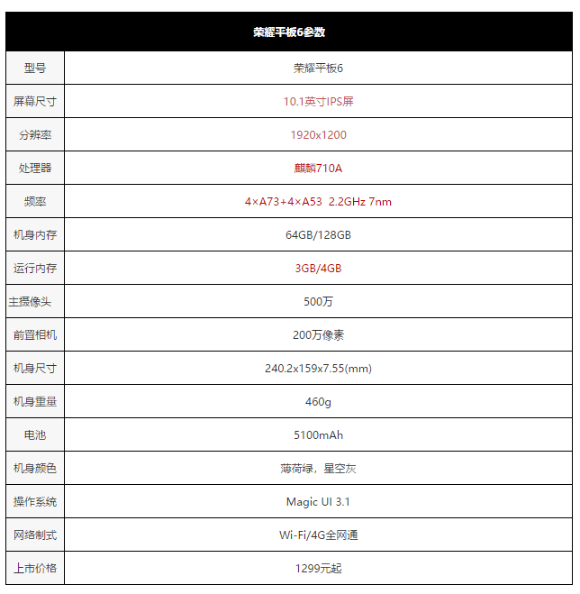 荣耀平板6采用一块10.1英寸屏幕,提供全高清的1920x1080分辨率,使用IPS屏幕,搭载麒麟八核高性能处理器,并且拥有大振幅扬声器立体声以及HUAWEI Histen 6.1音效技术。储存方面,荣耀平板6提供3GB/4GB的运行内存,还有64GB/128GB的机身储存,并且支持SD卡扩展内存。荣耀平板6提供5100mAh大电池,可惜没有提供快充支持。荣耀平板6提供了Wi-Fi版和4G全网通版。