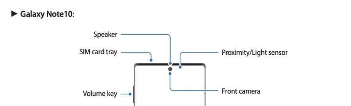 起初,我以为三星在 Note10 上采用了和 vivo NEX、华为 P30 Pro 类似的屏幕发声技术,但三星在官方说明书中又明确指出,Note10 的扬声器分别有 3 个:一个在底部,一个在顶部中框的小孔,还有一个就在前置摄像头的顶端,也就是边框部分。
