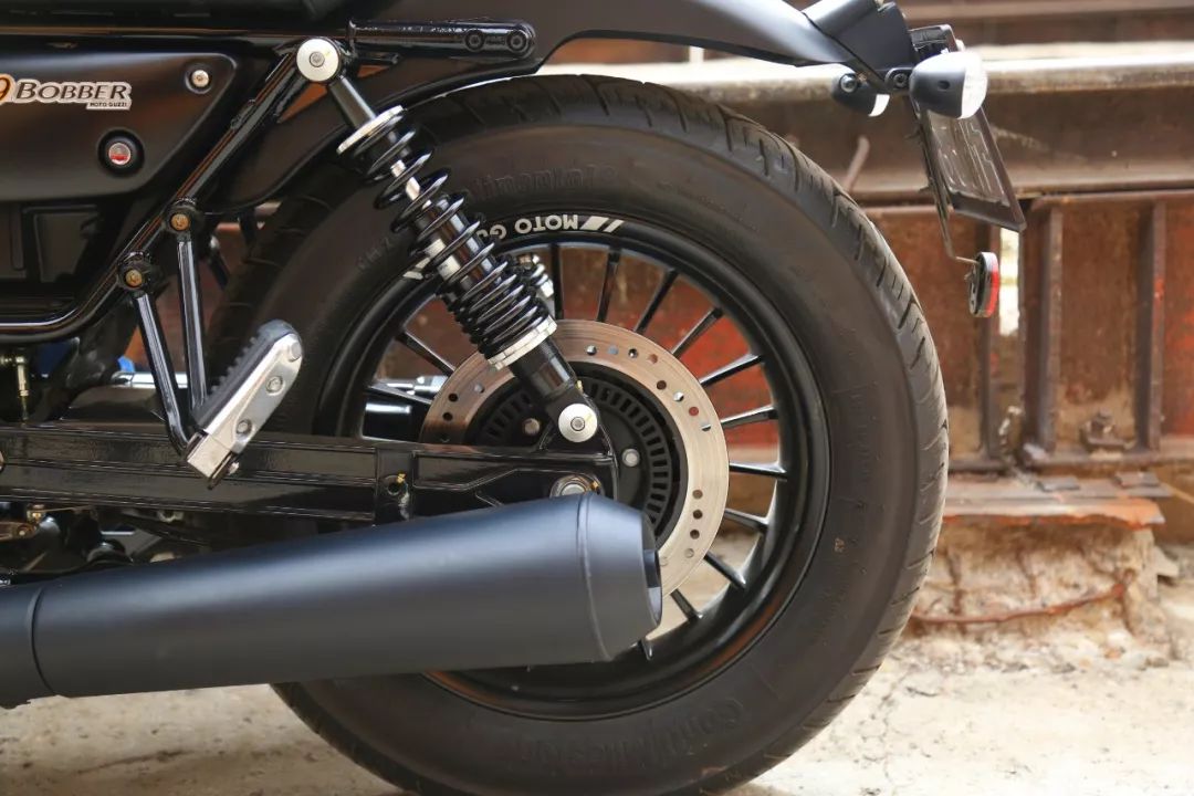 V9 Bobber的配置较高,16寸压铸仿铝合金辐条轮毂样式的轮毂配合马牌后轮胎有着不错的舒适性。前制动采用Brembo对四卡钳配320mm浮动盘,后制动为双活塞卡钳配260mm制动盘,厂家还在车头下贴心的配备了一个USB接口。前减震为直立式前叉,后减震预载可调。而在电子系统方面,除了标配ABS之外,V9 Bobber还带有可关闭的两段式牵引力控制系统,防止后轮打滑。从配置看,这款车并没有那么复古。